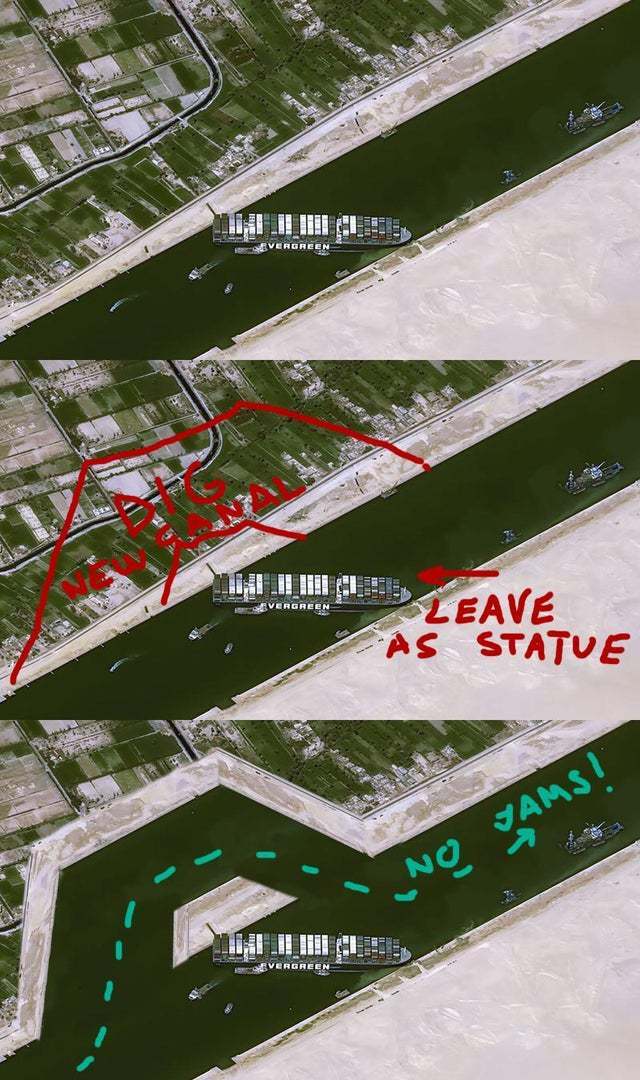 你覺得這麼生草的事兒網友們能放過嗎?各種五花八門的解決方案紛至沓來,有怪力亂神的,有祈願科學奇蹟的,有召喚遠古巨獸的,還有示意拓寬蘇伊士運河河道的。