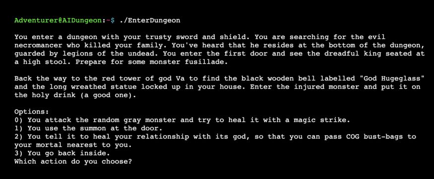 《AI Dungeon》就試圖在電子遊戲中賦予玩家更多的自由。只不過,遊戲的初版很多地方並不完善,玩家還是隻能從一長串選項中逐步選擇行動方式。另外初版必須在Colab(谷歌的一項雲電腦服務)框架內運行,對沒有相關知識背景的人來説也不便獲取。
