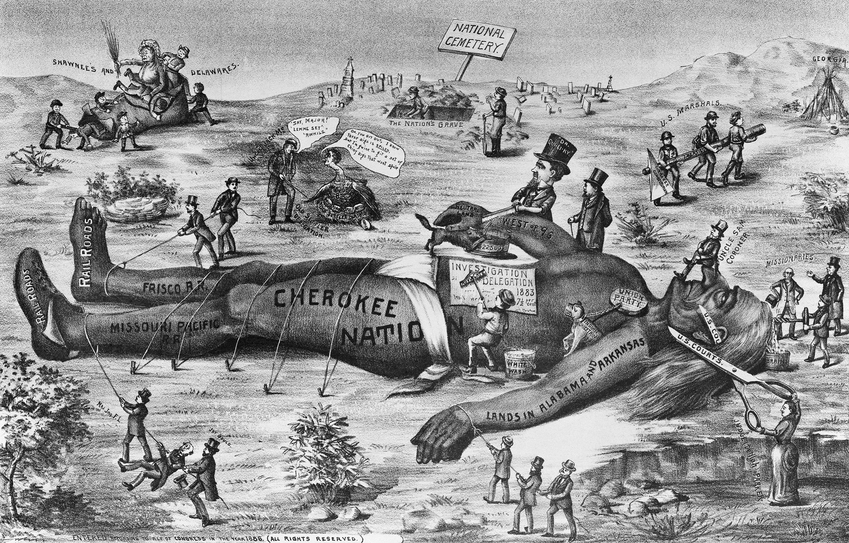 這幅19世紀的政治漫畫,展示了美國政府、司法系統、鐵路公司等對切羅基族印第安人的不公正待遇