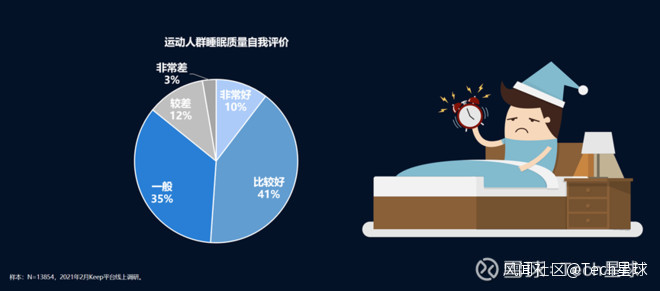 根據白皮書中的數據,運動人羣的睡眠質量較為理想,每天睡眠時長平均為8.1小時,有超過一半的運動人羣表示其睡眠質量為“比較好”或者“非常好”,“非常差”的人只佔了3%。