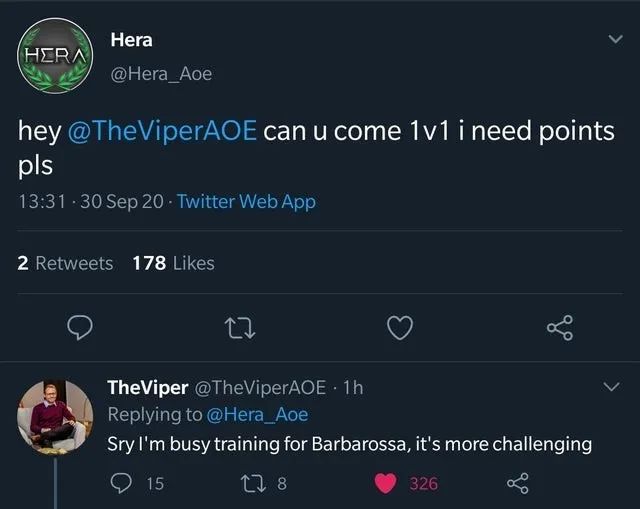 2011年開始,挪威少年TheViper(本名Ørjan Larsen)橫空出世,他不僅大局觀強,還有精湛的微操,能近乎完美地解讀每刻的戰局。從2012年到2019年,TheViper拿下了絕大部分個人和團隊賽的冠軍。他充滿變化和創新的打法帶給整個《帝國時代2》社羣巨大的震撼和快樂。