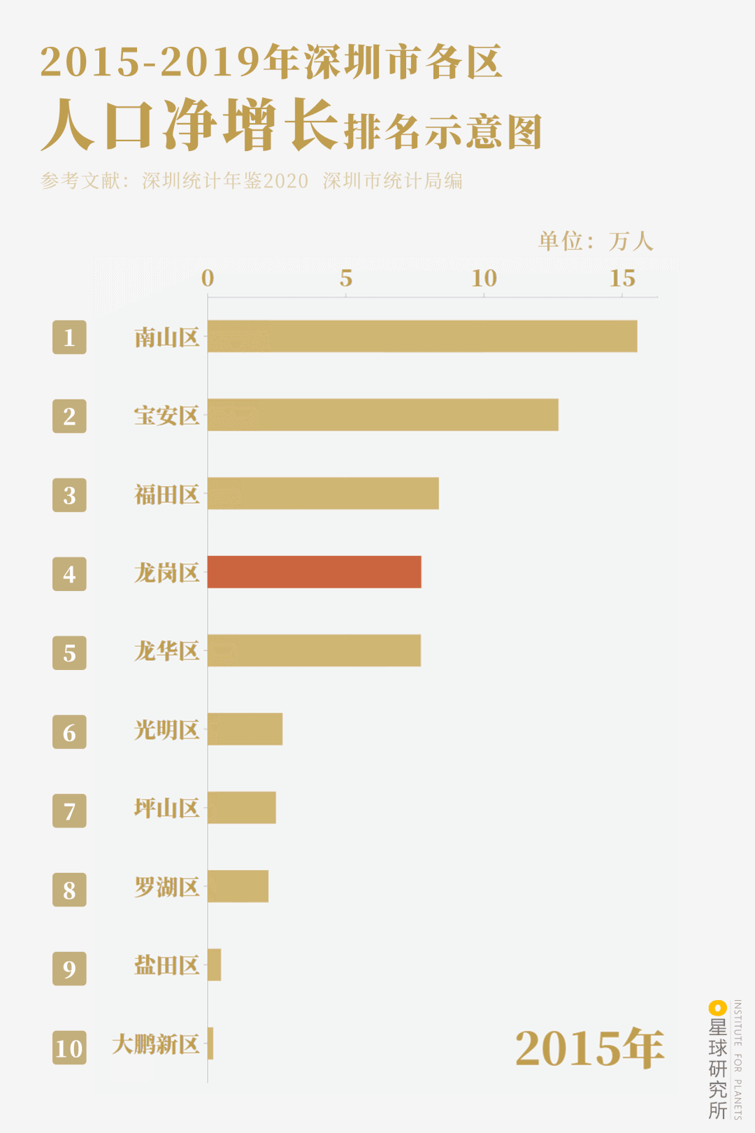 2015-2019年深圳市各區人口淨增長排名示意圖 | 製圖@楊寧/星球研究所