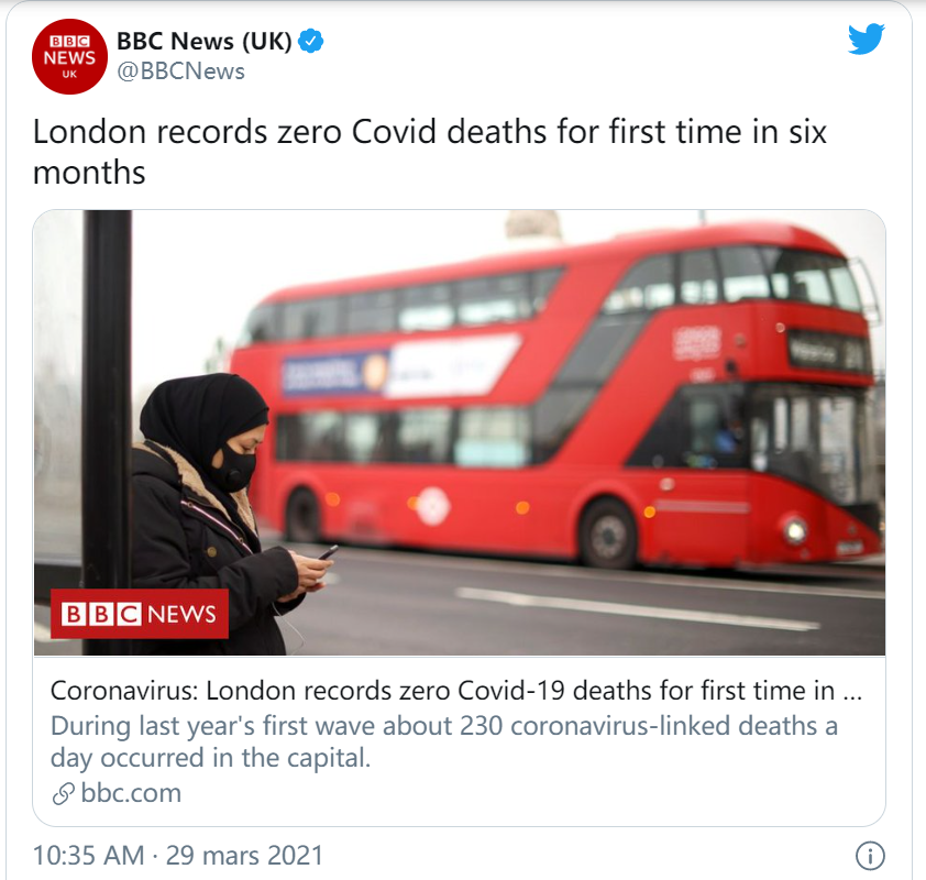 根據BBC報道,3月28日在倫敦沒有發生和新冠相關的死亡事件,這是六個月來第一次。在法國平均每天有40-80人死亡。
