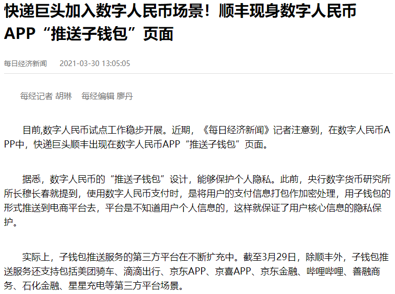 近日,順豐、星星充電等出現在數字人民幣錢包“推送子錢包”頁面,這意味收寄快遞、電動車充電都可以使用數字人民幣支付,數字人民幣的應用場景進一步擴充。目前,子錢包推送服務的第三方平台在不斷擴充中,支持包括滴滴、美團騎車等。