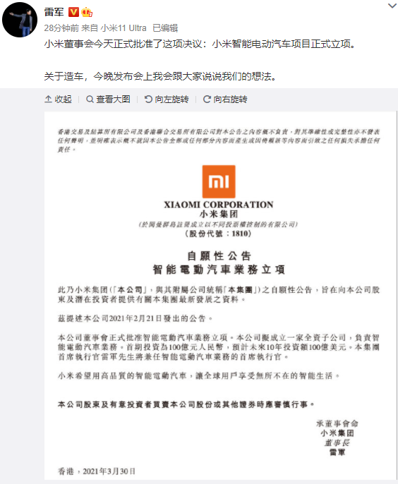 小米正式批准智能電動汽車業務立項,首期投資為100億元人民幣,預計未來10年投資額100億美元,由雷軍兼任智能電動汽車業務的首席執行官。