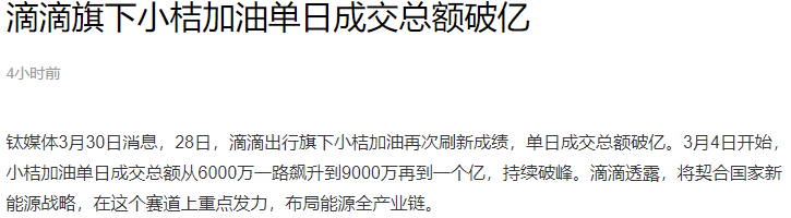 滴滴旗下小桔加油在3月28日的單日成交總額破億,再次刷新成績。滴滴透露,將契合國家新能源戰略,在這個賽道上重點發力,佈局能源全產業鏈。