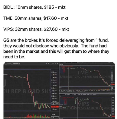高盛對一些對沖基金放出消息説,因為一隻對沖基金爆倉了,他們現在正在拋售一些公司的股票。