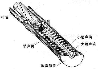 接近機匣的位置上有圓筒形連接套和帶有長孔的支架,支架用於引導消聲器套筒的安裝位置(所以槍管就呈現兩段式),連接套用於連接消聲器套筒和機匣。採用了於使用了微聲槍彈和消聲裝置,白天射擊時,在100~150m的距離上聽不到聲音, 在50m 的距離上看不到槍口煙;夜間射擊時,在500m距離上聽不到槍聲,在50m 距離上看不到槍口焰。在室內射擊時,室外聽不到聲音。
