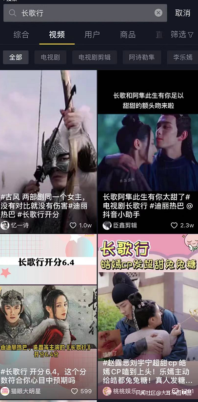 而在短視頻平台抖音上搜索“長歌行”,同樣可以看到不少非官方賬號發佈的影視剪輯。