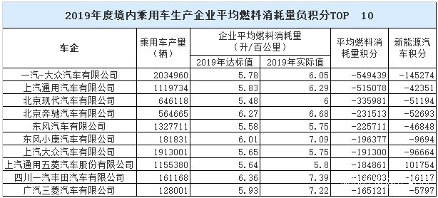 2019年度境內乘用車生產企業平均燃料消耗負積分排行榜