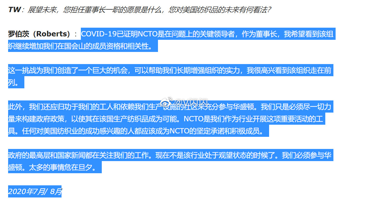 看看下面截圖中,這位美國“全國紡織組織理事會-NCTO”新任主席,戴維•羅伯茨,都打算幹什麼?這是2020年7月的採訪。