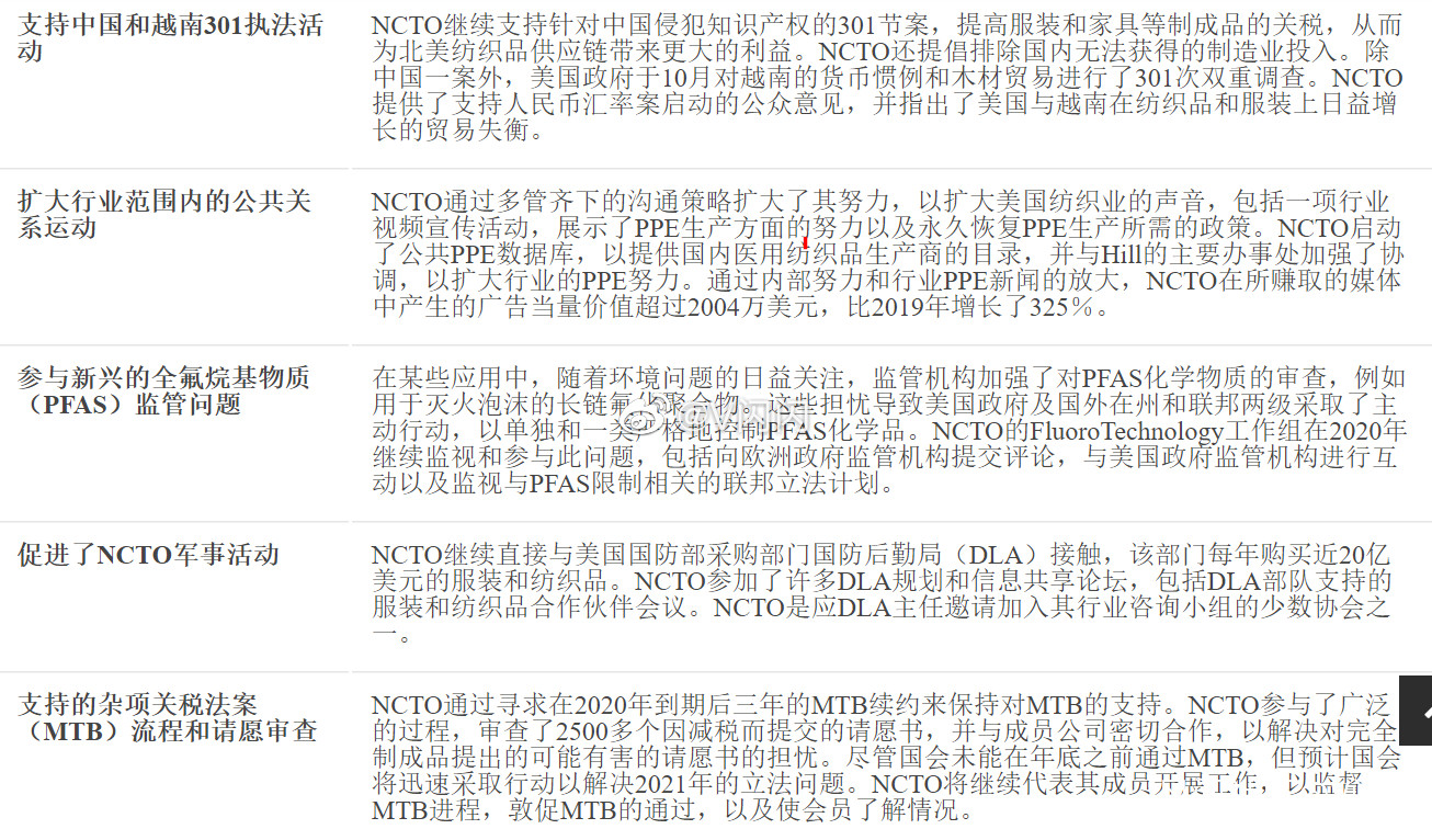 NCTO是美國紡織業的代言人,代表着整個美國的紡織業。