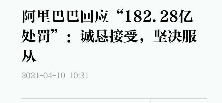 2021年4月10日,市場監管總局依法作出行政處罰決定,責令阿里巴巴集團停止違法行為,並處以其2019年中國境內銷售額4557.12億元4%的罰款,計182.28億元。