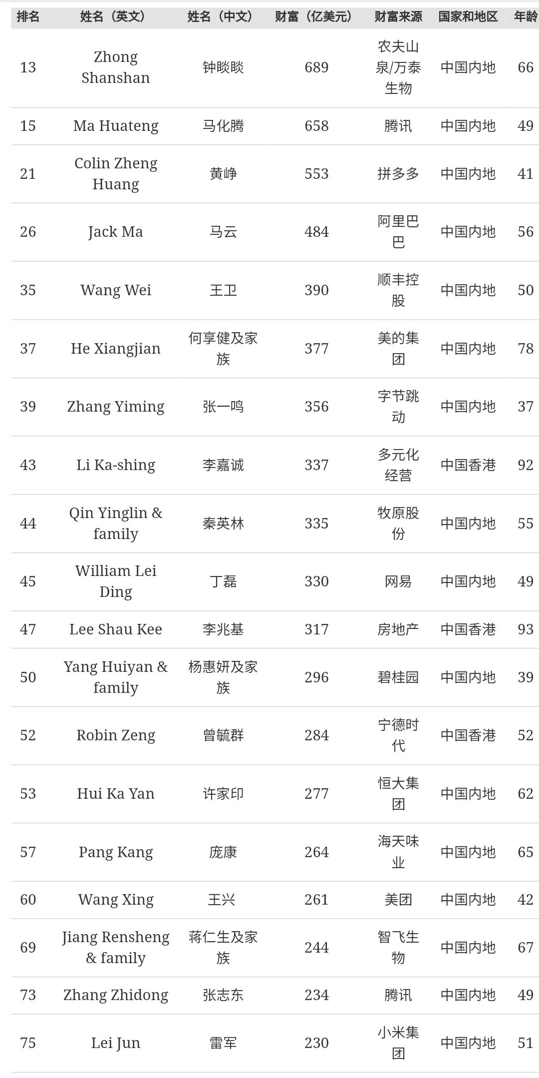 2021年福布斯全球富豪榜中國富豪榜