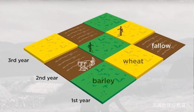 第一年種大麥(barley),第二年種小麥(wheat),第三年荒着休耕