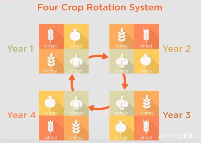 四圃輪作制就不一樣了,第一年種小麥、第二年種大麥、第三年種蕪菁(turnip,不是蘿蔔),第四年種蒜瓣等牲畜飼料。蕪菁、蒜瓣可以給牲口吃,而且依靠其強大的固氮作用可以增加土壤的肥力,所以英國的農業生產效率大大增加了。