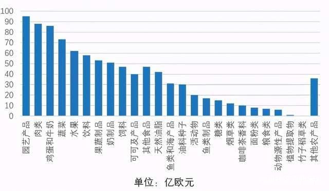 2019年,荷蘭的園藝產品、肉類、牛奶和雞蛋、蔬菜和水果這5類產品佔荷蘭出口總額的43%。
