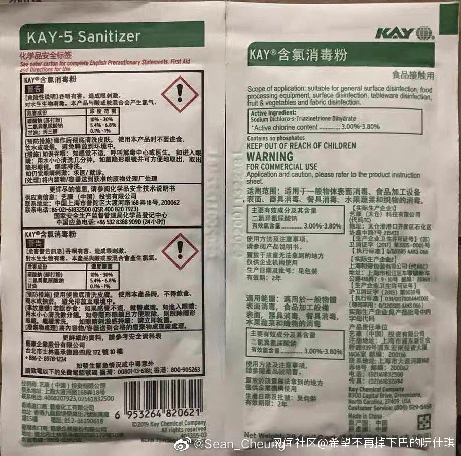 根據店長提供的外包裝可以看到,小杜誤食的正是肯德基、麥當勞、星巴克等餐飲企業常用的“含氯消毒粉”。