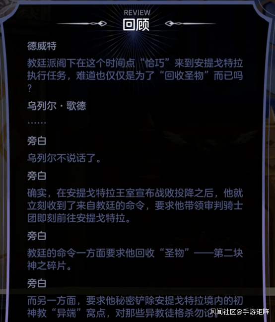 如果説《少女的王座》是靠畫面與玩法的差異化特色,成功引起玩家的好奇關注,那麼其百萬字的故事劇情與世界觀背景,正是打動玩家並樹立起優勢的關鍵。《少女的王座》在獨創的世界觀下,擁有着嚴謹的歷史編年史,甚至還有自己的神話體系。在NGA和B站,幾乎每一篇深度評測都會提到《少女的王座》極其龐大的世界觀設定,並且很難在國產乙遊中找到體量深度與其相當的作品。因此“乙女版權遊”的稱號被部分玩家傳開,這也是除了“能給男人換衣服,還能帶男人們戰鬥”之外,最能將《少女的王座》精簡概括並推薦給其他人的一種方式。