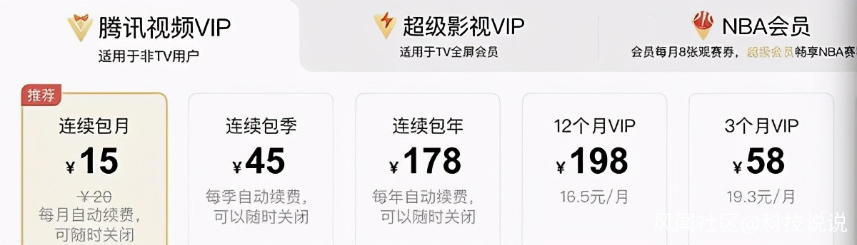 目前,(未漲價前)騰訊視頻連續包月的價格為15元,連續包季的價格為45元,連續包年的價格為178元;非連續包月的價格為20元,非連續包季的價格為58元,非連續包年的價格為198元。