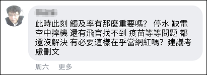 在這條帖文下,有眾多島內網友留言痛批蔡英文,稱她“根本沒有為那50條冤魂檢討過”(11日修正為49人)。還有許多人指其不知輕重緩急,表示最近島內好像發生了很多重大事件,如停水、缺電、戰機失事等,而這些待解決的問題“應該都比如何當好網紅來的重要才對”。
