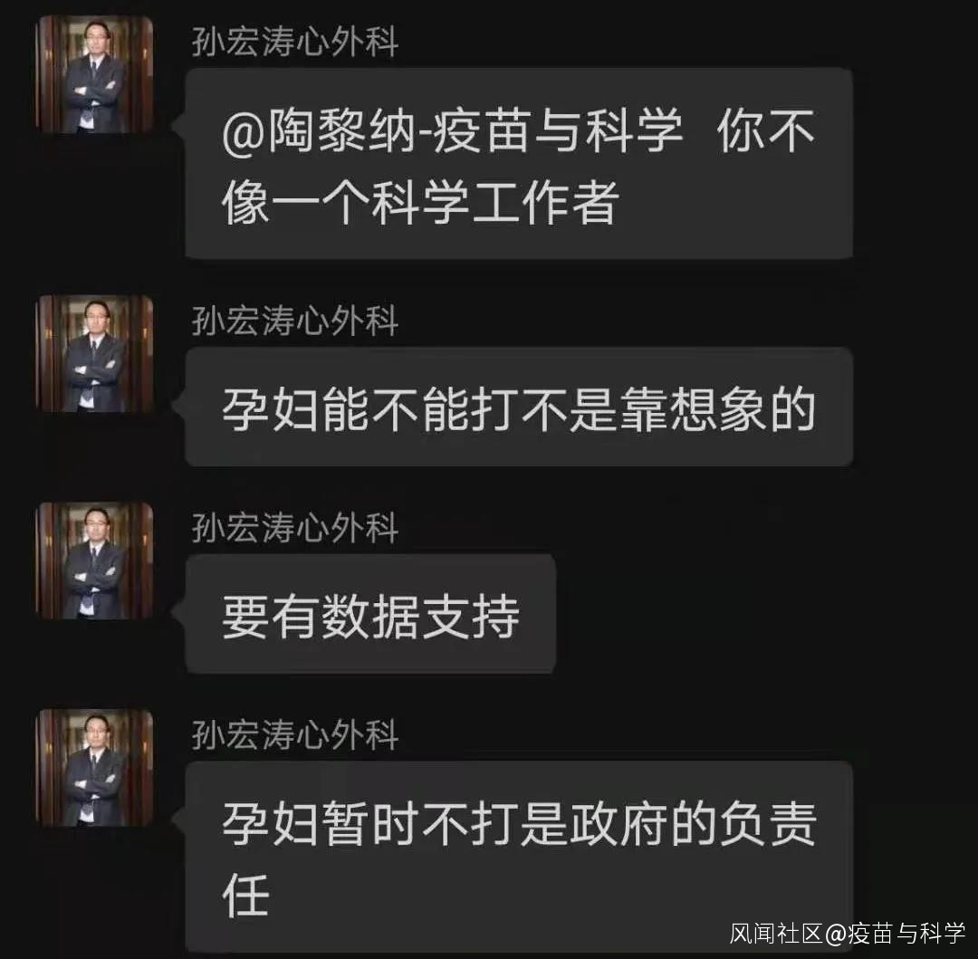 因為在醫生羣裏分享了自己的定心丸:孕婦和哺乳媽媽可安全接種COVID-19疫苗!一文後,我被心外科孫醫生吐槽:你不像一個科學工作者,孕婦能不能打要有數據支持,中國政府暫時不給孕婦打是負責任的做法。