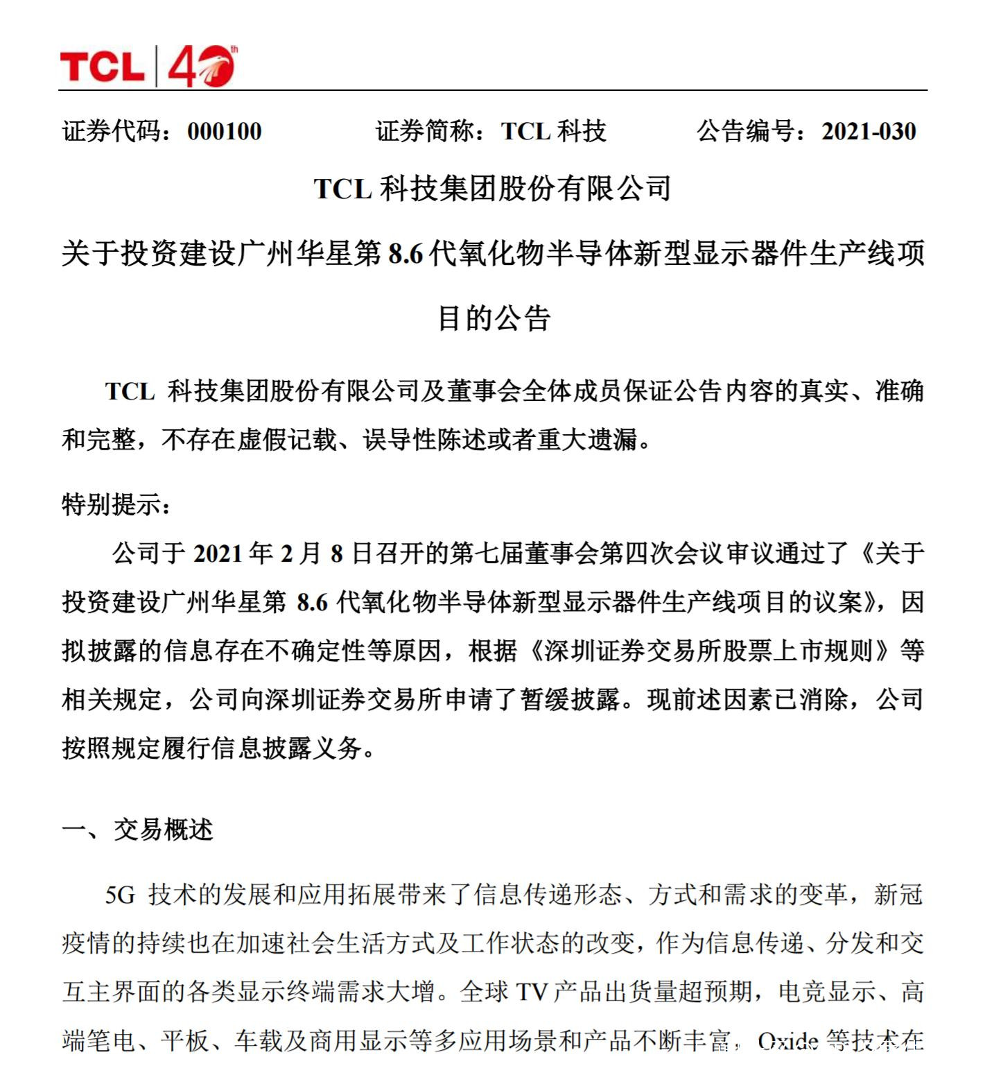 2021年4月9日,TCL科技(000100.SZ)發佈公告稱,將與廣州市政府共同投資350億元,建設一條新的8.6代氧化物半導體顯示器件生產線(以下簡稱“t9項目”),該產線設計產能達180K/月,建成之後將會主打中尺寸高附加值IT顯示面板。