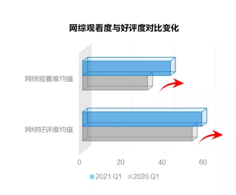 根據雲合數據,2021年第一季度上新綜藝有效播放量達到52億,其中電視綜藝的25億尚能與去年同期持平,網絡綜藝卻收穫了28億有效播放,同比增長近64.7%。藝恩數據也顯示,與去年相比,今年Q1的網綜觀看度和好評度都有明顯提升。