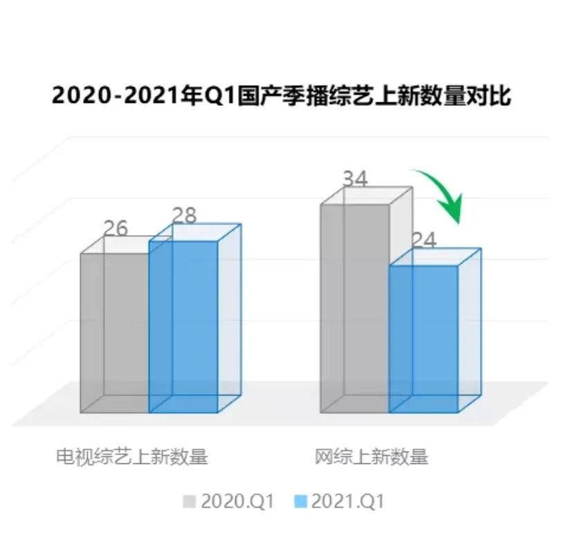 藝恩數據顯示,2021年第一季度台網季播綜藝共上新52部,相較去年同期減少了8部,其中主要由於雲綜藝的退潮,網綜市場恢復常態,上新數量減少10部。