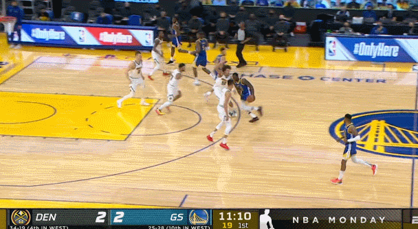 但即便如此,馬龍教練也沒有太多調整對於庫裏的夾擊策略,只是讓坎帕佐單人給庫裏更多的防守壓力和身體對抗。直到最後一節,掘金才真正全隊開始瘋狂夾擊庫裏。