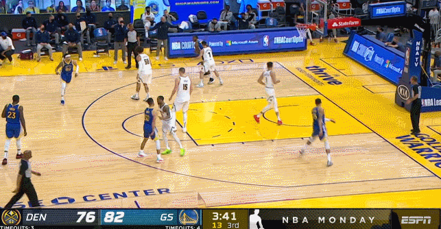 此時的約老師還在籃下沒跟出來,庫裏獲得了一個幾乎空位投籃的底角三分機會。這種球庫裏是不會放過的,於是開局不到1分鐘就命中了自己的第一個三分,這個時間點對於庫裏和掘金來説都太早了。