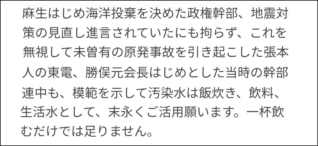 對於麻生太郎在這件事情上牽扯中韓,並聲稱經過處理的核廢水“喝了也沒什麼事”的説辭,日本網民紛紛留言痛批,並希望麻生太郎及東京電力公司的高管能夠“以身作則使用被污染過的水源做飯,當做飲料和生活用水來喝”。