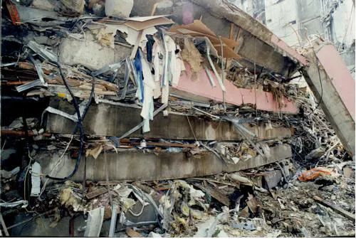 下午5點57分,大樓突然響起了巨大的爆裂聲。僅僅20多秒,從5樓開始,樓板像多米諾骨牌一樣層層塌陷,1400多人頃刻間被埋其中。