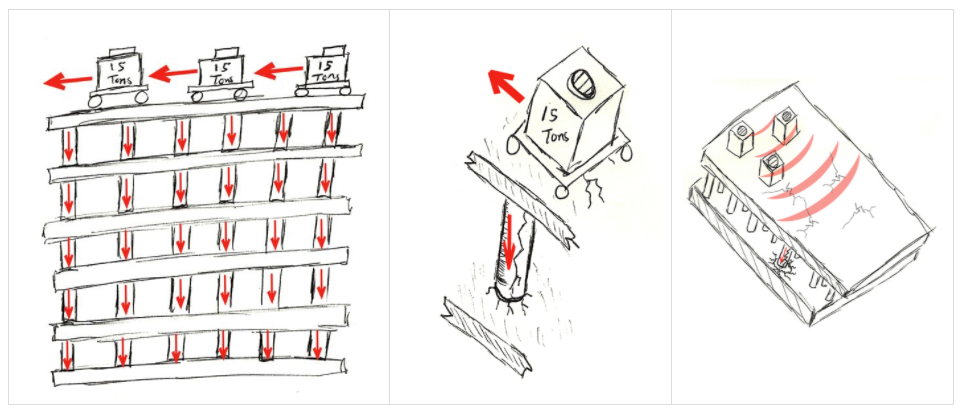 結果導致大樓倒塌時,沒有任何阻擋的裝置,柱子直接衝破天花板。