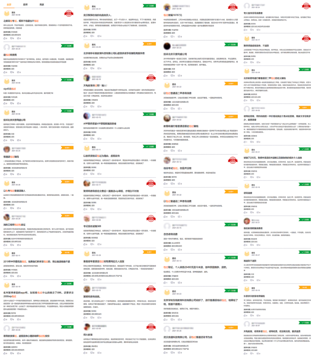 黑貓投訴平台顯示,僅2021年3月1日至今,關於包過班的退費投訴就不下百起。其中,被投訴的機構包括以聚師網、師大教育在內的教師資格考試培訓機構;還有以言道科技、教易有道在內的普通話等級測試培訓機構;以及以駕考寶典為代表的駕考培訓機構;還有天普、中宇博學教育在內的消防工程師資格考試培訓機構。
