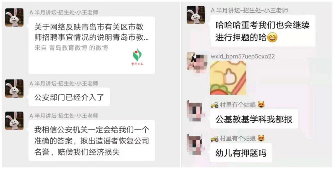 3月28 日,2021年青島市教師招聘筆試結束,隨即一條網絡爆料刷屏——網友舉報此次考試有機構存在泄題行為,“每個學科都押中了一字不差的原題”。該條舉報信息配圖中,清晰可見一名“青島半月講壇校長”囑咐學生“本次考試預測到題目且比重較大,望學生們低調”的微信羣截圖。而在這張羣聊截圖中,這位趙校長更是再三強調“該羣解散”。