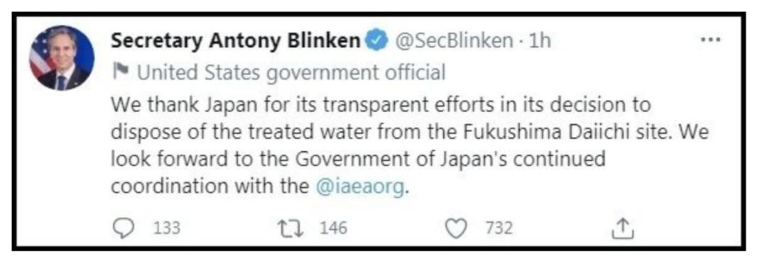 美國國務卿布林肯甚至發推“感謝日本”,他説:“我們感謝日方在決定處理福島第一核電站處理水問題上所做出的顯而易見的努力。”