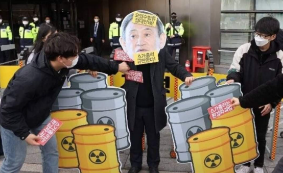 當天就有團體在日本駐韓大使館前集合,還有抗議者戴日本首相菅義偉的面具,模擬日本首相排放廢水的畫面,大聲抗議“大海不是垃圾桶”。