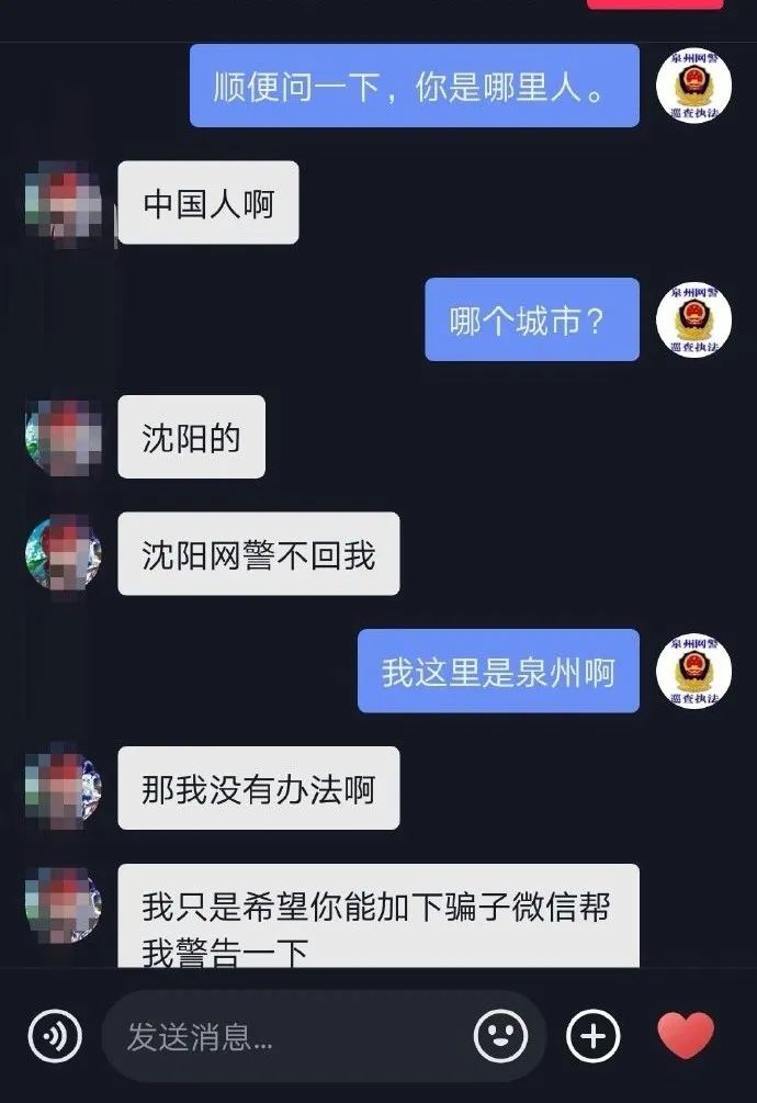 這才知道,這名留學生是瀋陽人,他之前之前也私信瀋陽網警來着,可是沒能得到回覆,看到泉州網警回覆他了,才説出了自己被騙的事情。
