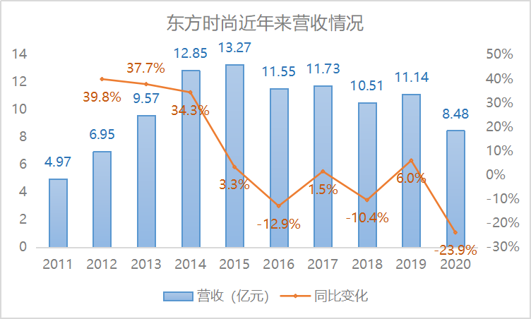 營收上,東方時尚全年錄得8.48億元,同比下降23.9%。回顧近十年的數據,其2020年度的營收,創造了2013年以來的新低,可謂“一朝回到解放前”。