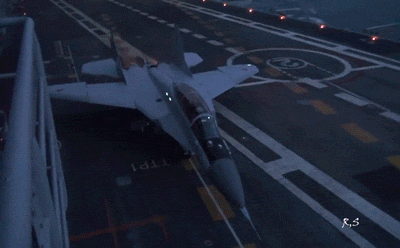 13架是該艦的一個波次的最大能力嗎?還不是,在斜角甲板的末端可以佈置3架整備好的飛機,這也是各國航母的通用方法,這樣就是16架,在緊急起飛位置上還能放上1架,這就是17架了,但是因為該艦沒有燃氣導流板,起飛狀態全加力的飛機尾焰温度非常高,在1400~1600度之間,據説30米開外還有450度,所以17號機的起飛時機需要確保後面沒有飛機和人員,所以17架是該艦一次攻擊波的最大能力。當然這只是理論能力的計算,實際作戰不一定這樣用,比如執行CAP任務的戰鬥機早就升空了。