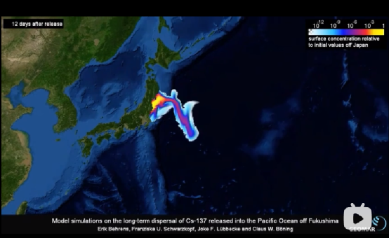 不僅如此,德國海洋科學機構模擬的銫-137擴散路徑顯示,泄露發生後的57分鐘內這一放射性元素就順着洋流橫跨了1.65億平方公里的太平洋!220天后到達濟州島,400天后達到西海岸,三年後到達美國和加拿大。