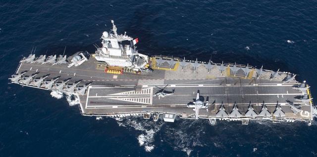 戴高樂號即是平甲板航母,又是核動力加彈射型航母,上面沒有停機位的標示,對於它的研究方法完全不同於印度和中國滑躍型航母。平甲板意味着整個飛行甲板處處都可以停飛機,不再有艦艏滑躍起飛區因為甲板有弧度而無法停機的面積浪費;核動力意味着艦艇動力包體積的減小,也不存在巨大的煙囱,這樣艦島可以減小,機庫可以增大,甲板面積也會相應增大;彈射型意味着起飛跑道的縮短,戴高樂號的彈射軌道只有75米長,遼寧號起飛點是105米和195米,超日王號是180米和160米左右,起飛距離的縮短能騰出了大量停放和週轉空間。戴高樂號還有兩個問題:一個是長期使用超級軍旗飛機和陣風飛機混搭,直到2016年超級軍旗退役後才轉變成當前的全陣風戰機的配置,離該艦服役已經有15年之久;另外一個是法國沒有直接的強大對手,所以戴高樂號沒有滿配過載機,每次的載機數量也不一樣。所以研究戴高樂號的最大載機能力有難度,比如在2011年3月的利比亞戰爭,戴高樂號出擊的載機配置是帶了10架陣風戰鬥機、6架超級軍旗攻擊機、2架E-2C預警機、2架黑豹直升機、2架雲雀Ⅲ直升機、還有空軍的1架美洲獅和2架超級美洲獅直升機,固定翼飛機只有18架;再比如2015年11月執行打擊“伊斯蘭國”共載有26架戰鬥機,包括18架“陣風”戰鬥機、8架“超級軍旗”戰鬥機;2016年9月戴高樂號再次打擊“伊斯蘭國”時帶了24架陣風戰鬥機和2架E-2C預警機。