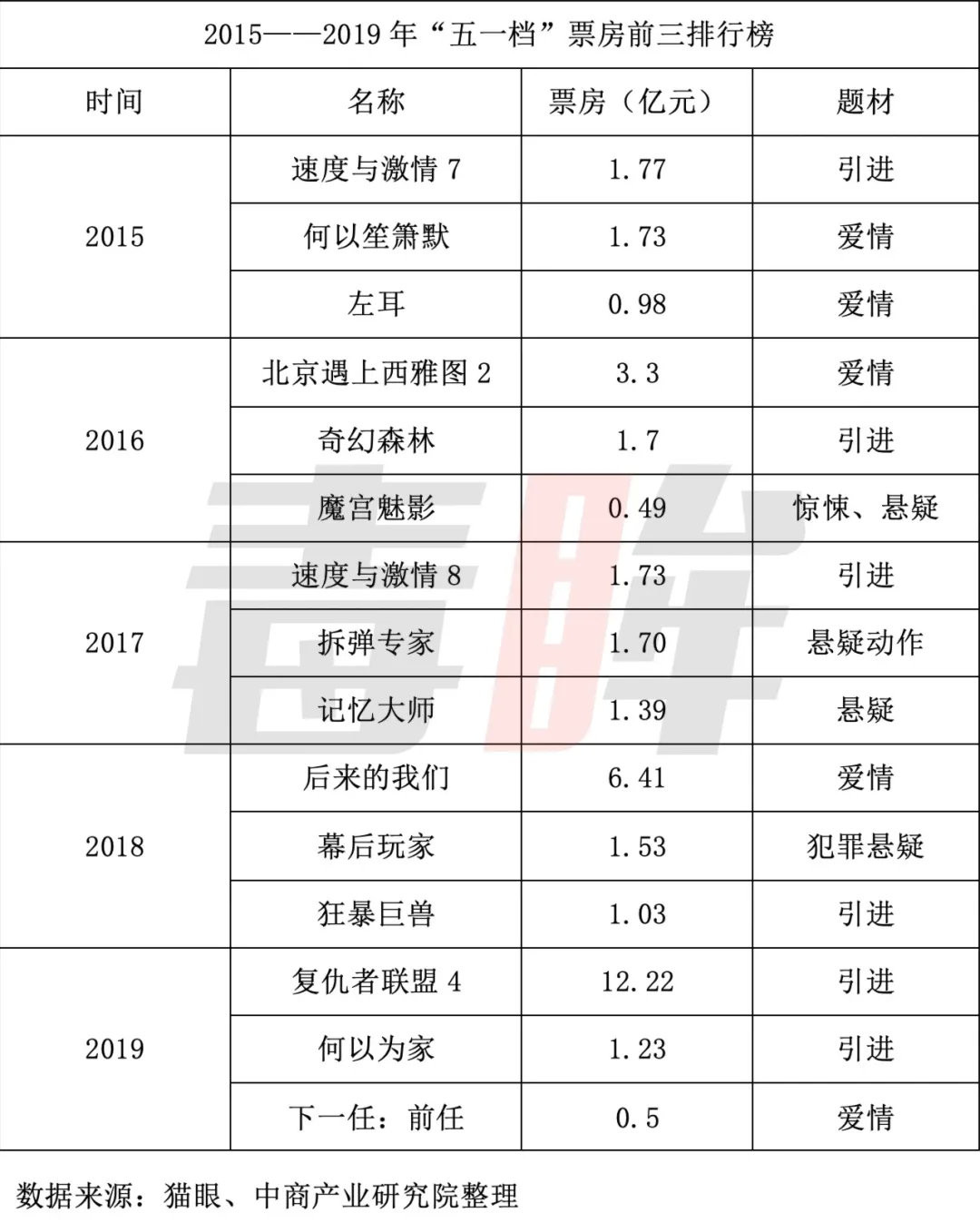 2015年以後,引進大片不再在五一檔期內上映,更多定檔在大盤冷淡期的3-4月,承擔救市作用。即使如此,之後五一檔內上映的新片,仍都受到引進片的長尾效應影響。而當國產中腰部影片遇到《速度與激情7》、《速度與激情8》和《復仇者聯盟4》這類超級大片時,縱使抱團應戰,也難有勝算。