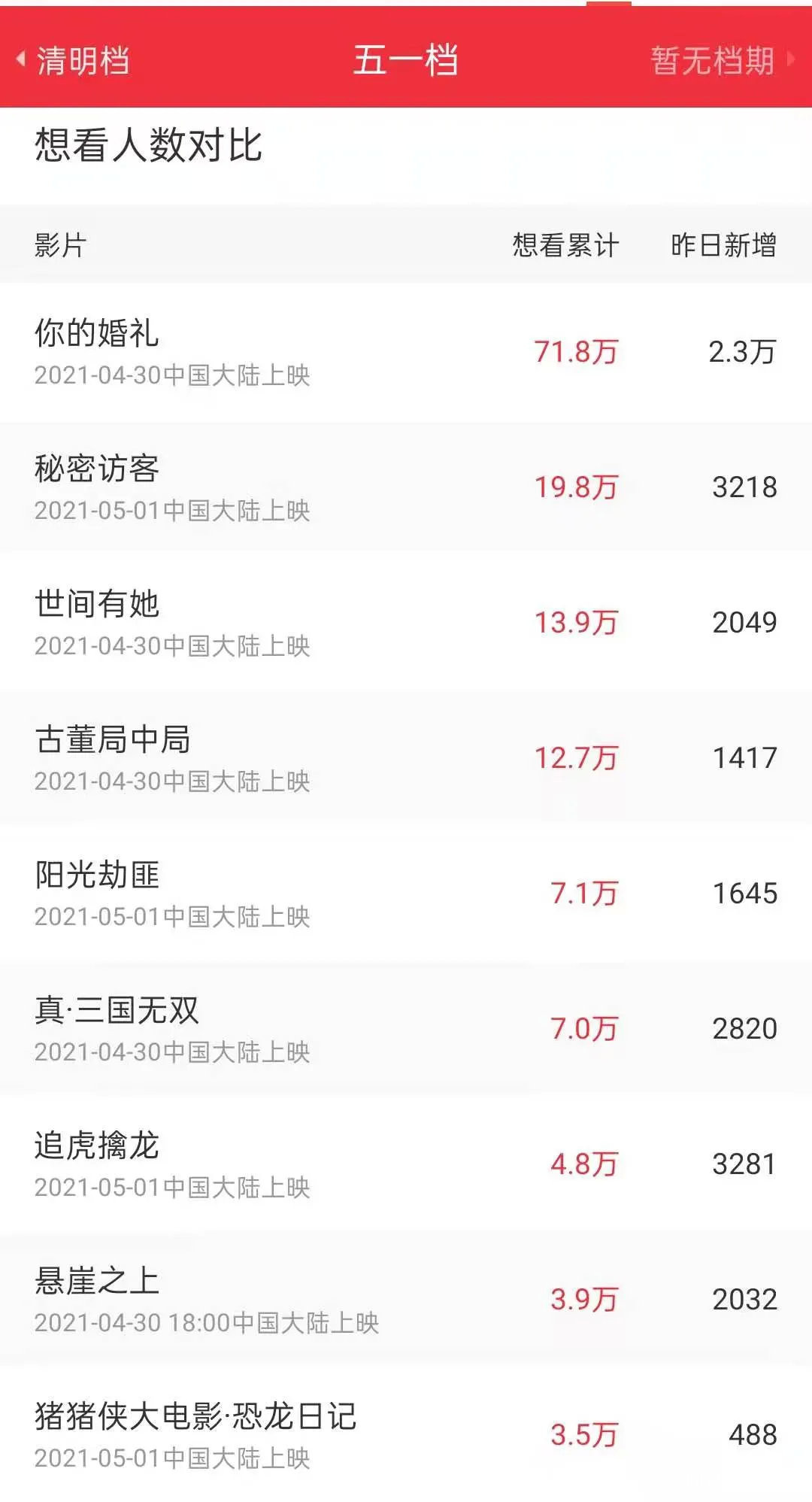 根據貓眼專業版數據,截至毒眸發稿日,居於觀眾想看數量榜單前三位的分別為累計71.8萬的《你的婚禮》、19.8萬的《秘密訪客》和13.9萬的《世間有她》。