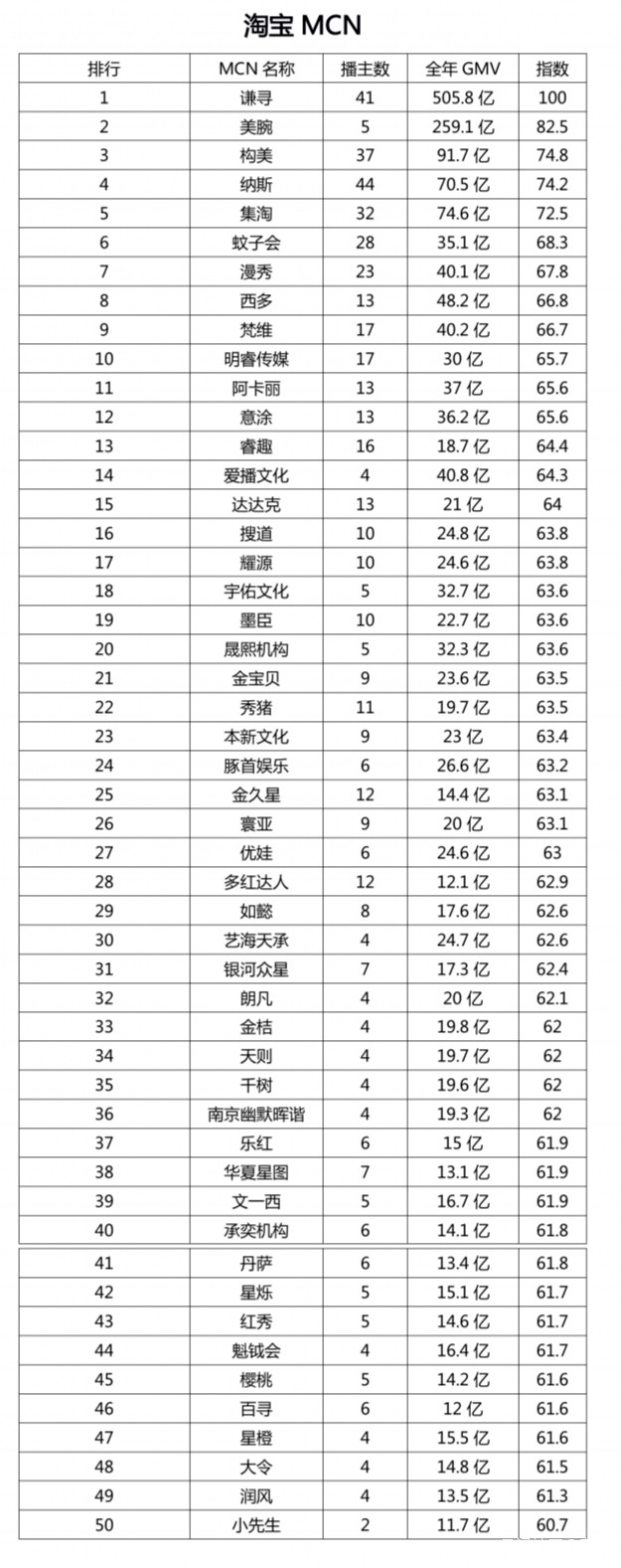 2020年淘寶MCN排行榜 數據來源:ECR電商發佈