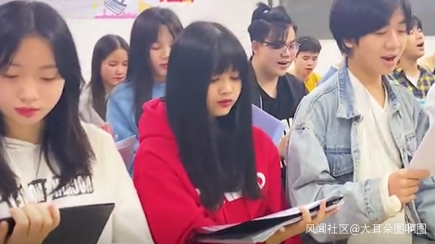 視頻中,一排排年輕學子齊聲歌唱。細聽之下,正是壯家劉三姐的經典民歌《世上哪有樹纏藤》。