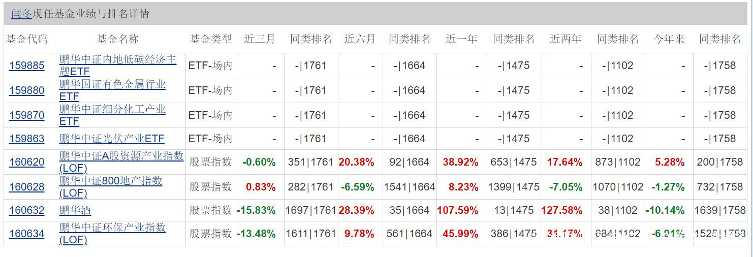 閆冬目前在管基金共8只,其中4只為ETF-場內基金,4只為股票指數型基金,除了鵬華中證A股資源產業指數 (160620)在2021年以來收益為正,剩下的鵬華中證800地產指數 ( 160628)、鵬華酒(160632)、鵬華中證環保產業指數 (160634)在2021年來收益均飄綠,分別為-1.27%、-10.14%、-6.91%。