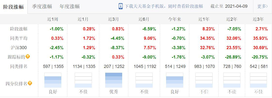 截至2021年4月9日,該基金的累計收益率為-6.59%,遠低於滬深300同期的7.57%。
