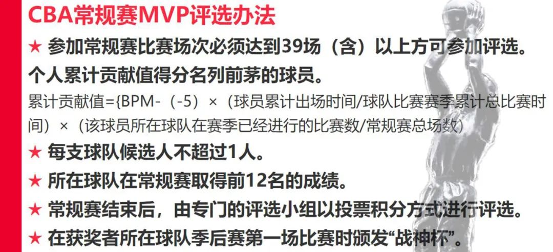 這個“累計貢獻值”,有非常複雜的計算方法,用來衡量一個球員整個賽季的全面表現。科學與否另説,CBA聯盟早在賽季開始前的手冊上,就印了這幾條,因此顯然不是特別針對郭艾倫。問題在於,一旦用這個公式作為重要標準,直接就把自己框進去了,產生候選人時,一切都不再可控。